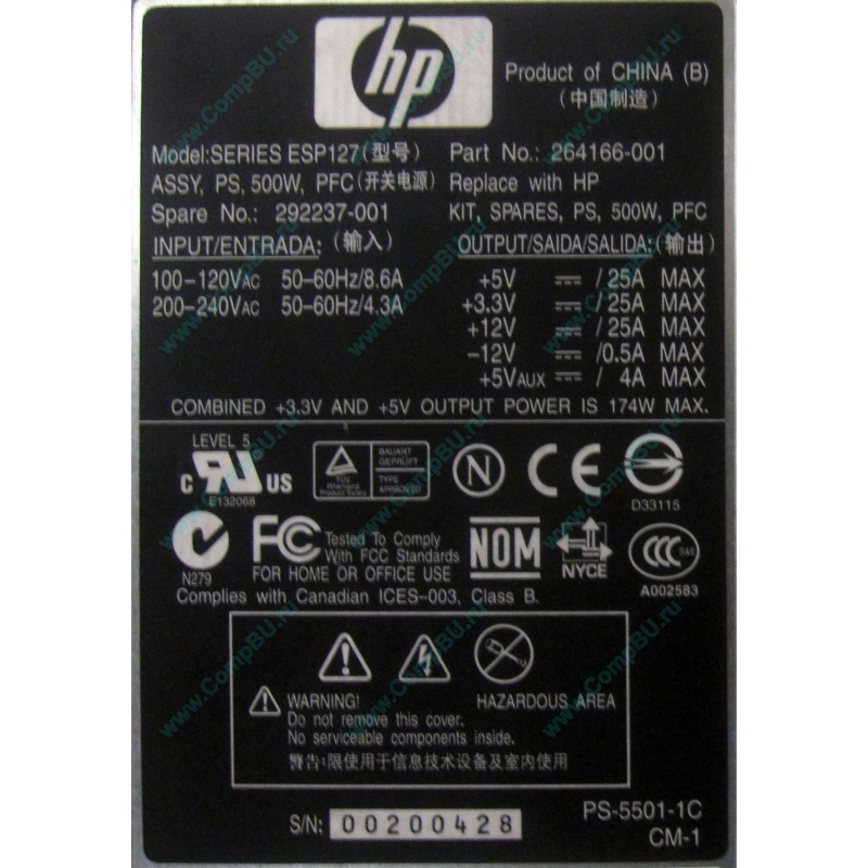 Блок питания HP 264166-001 ESP127 PS-5501-1C 500W (Дубна) Изображение большего размера