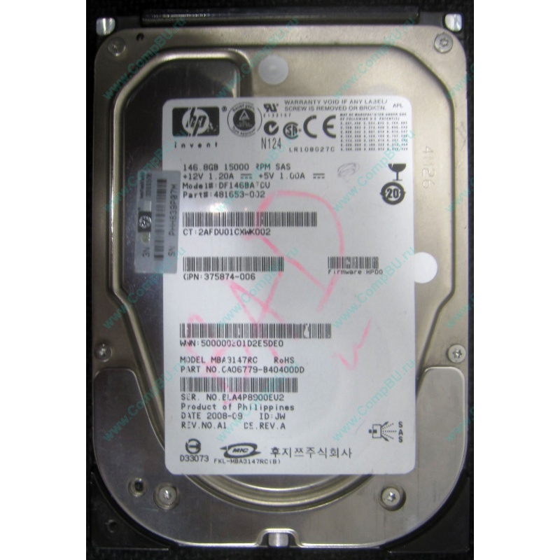 Нерабочий жёсткий диск 146Gb 15000 rpm SAS HP p/n 481653-002, model DF146BAFDU. Продается "как есть".